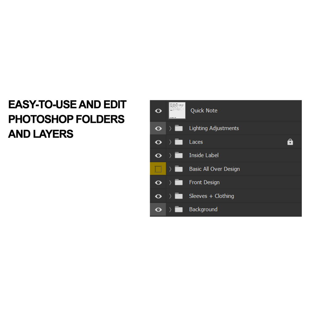 Extra Features: On top of everything, you can also edit the background in any color or gradient you want and even select between some ecommerce-focused backgrounds prepared for you. On top of all layers there is a folder with adjustment layers that will let you edit the brightness, contrast and the saturation of the clothing and the designs on top of it. Lastly, each clothing will have a dropshadow effect that is easily turned off or on.